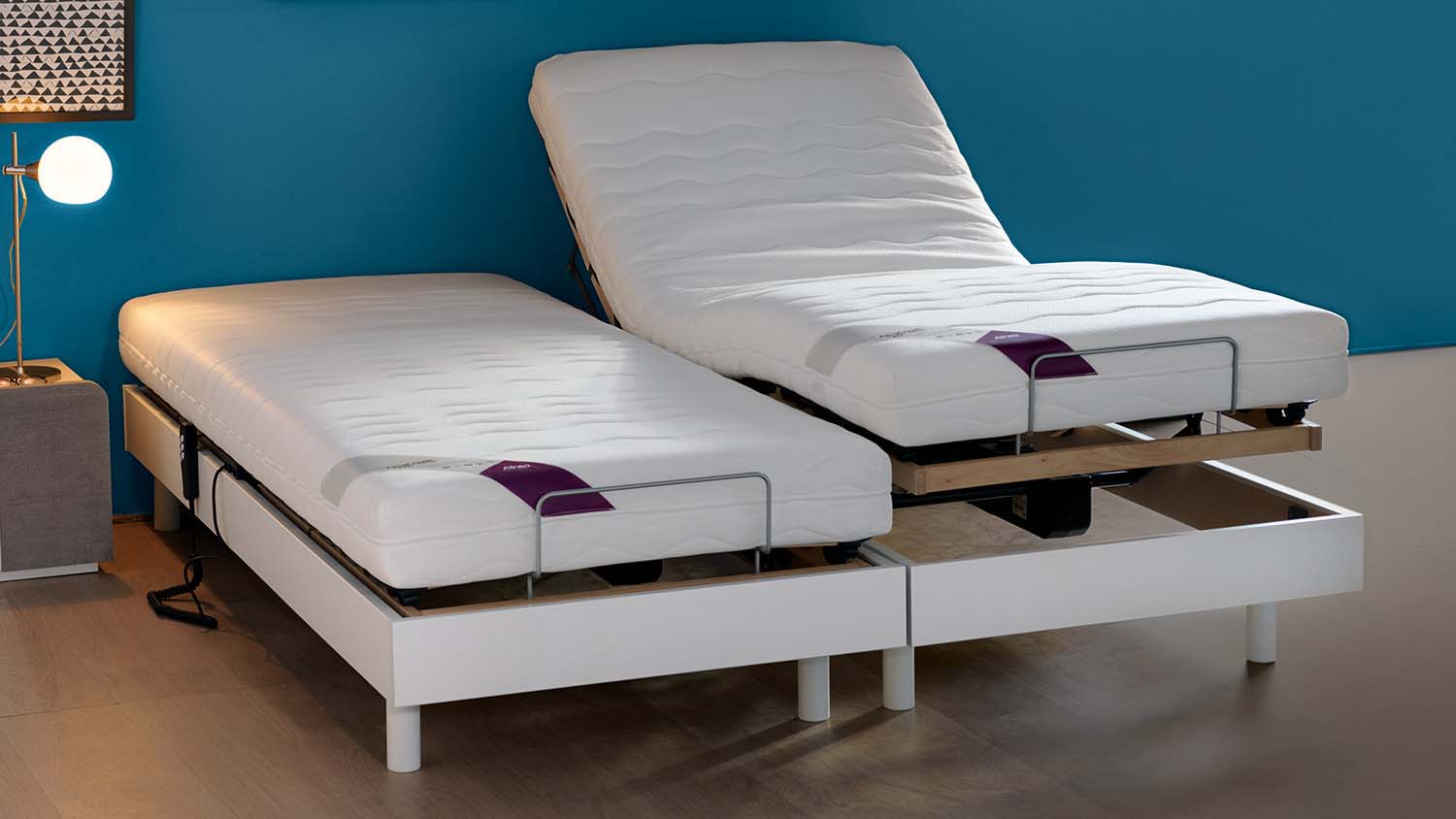 Les sommiers électriques, dits aussi « sommiers de relaxation », sont des sommiers à panneaux de lattes articulés. Grâce à un moteur électrique, le sommier peut être relevé au niveau de la tête, des épaules, des cuisses et des pieds. C’est une solution intéressante pour les personnes passant beaucoup de temps au lit, pour lire ou regarder la télévision. De plus, la position relevée des pieds favorise la circulation sanguine. Les sommiers électriques sont munis de deux ou quatre moteurs. Un lit à deux moteurs permet de régler la hauteur des parties hautes (tête / épaules) et basses (cuisses / pieds). Les modèles à quatre moteurs disposent d’un réglage indépendant, pour chacune de ces parties du corps.