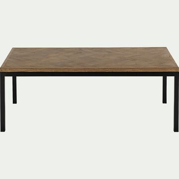Cette jolie table basse rectangulaire trouvera aisément sa place dans votre salon. Vous serez séduit par cette association de matériaux. Le bois foncé du plateau et le métal noir des piètements se marient à la perfection pour vous proposer un meuble au design brut. Pour un style plus authentique, elle pourra se mixer avec un canapé en cuir et des matières comme le bois brut ou le métal brossé. Elle s'adaptera à tous les intérieurs et y apportera du cachet.