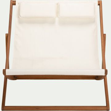 Dans un jardin, sur un balcon ou au bord de la piscine, pour lire ou refaire le monde, la chilienne de jardin Bocca a été imaginée pour un moment de pure détente à deux. Vous n'aurez plus qu'à vous mettre d'accord sur le choix du degré d'inclinaison entre les trois disponibles, mais chacun disposera de son coussin de tête. Véritable invitation au partage et à la convivialité, elle accompagnera votre quotidien d'un confort bienvenu, du printemps à l'automne. Avec sa couleur blanc écru, cette chilienne donne un côté méditerranéen à votre extérieur. Cette chilienne est idéale pour un moment de détente tout en décorant votre jardin.