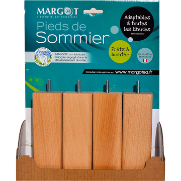Des pieds de sommier prêts à monter sur votre sommier tapissier. Ce jeu de quatre pieds sera parfait pour un lit naturel, grâce à leur matière authentique : du hêtre massif couleur brute.