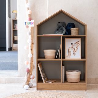 Cette étagère en bois clair transforme le rangement en jeu d’enfant. Avec ses cinq cases ouvertes et sa silhouette en forme de maison, elle ajoute une touche ludique à la chambre tout en facilitant l’organisation. Livres, doudous, jouets ou petits objets déco trouvent facilement leur place. Confectionnée en bois certifié FSC, elle arbore un fond vert olivier pour une touche de couleur. Un petit meuble aussi pratique que chaleureux, qui stimule l’imaginaire des plus petits.
