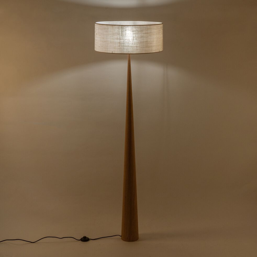 Abat-jour en coton et pied de lampe en métal avec placage bois.