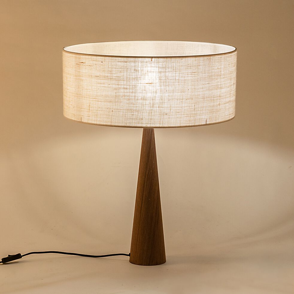 Abat-jour en coton et pied de lampe en métal avec un placage bois.