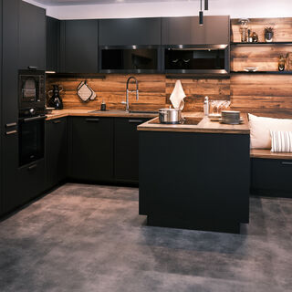 Esprit “architecte” dans l’air, cette cuisine sobre et design a tout pour plaire : un style urbain où chaque détail compte. Les lignes sont marquées d’un noir ébéne profond - des meubles au choix de l’électromenager. Une atmosphère élégante qui ne manque pas de convivialité.