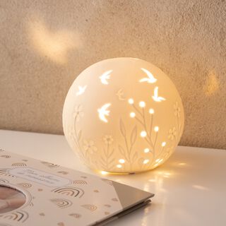 La lampe enfant Nidou diffuse une lumière tamisée à travers son globe en porcelaine blanche délicatement ajouré. Des motifs de feuillages et d’oiseaux s’animent subtilement à la lueur de l’ampoule, comme un petit théâtre d’ombres féériques. Ce bel objet décoratif transforme la chambre en cocon apaisant, parfait pour accompagner le rituel du coucher et inviter les rêves à prendre leur envol.