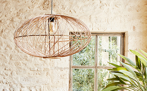 Si vous souhaitez conserver un aspect le plus naturel possible, il est préférable de choisir une suspension en bois ou en tissu qui n’a pas été peint. Cela vous laisse tout de même de multiples possibilités, tant les teintes divergent entre un bois de palmier, un tissu de raphia, un lustre en bambou, etc.