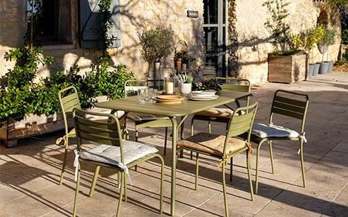 Pour créer un extérieur harmonieux, la table ne vient jamais seule. alinea propose une sélection de chaises de jardin avec ou sans accoudoirs, pensées pour s’associer naturellement aux modèles en acier. L’assise est travaillée pour offrir confort et stabilité, tandis que les finitions se coordonnent aux plateaux des tables. Les salons de jardin peuvent ainsi être composés selon vos envies : bancs, fauteuils ou canapés d’extérieur complètent l’ensemble pour accueillir tous vos moments de détente. Quelques coussins, un tapis d’extérieur, des luminaires solaires et l’espace prend vie avec cohérence. En un clin d'œil, votre terrasse devient un lieu de vie à part entière, à la fois accueillant, fonctionnel et esthétique. Grâce à l’univers complet proposé par alinea, chaque jardin raconte une histoire, la vôtre.